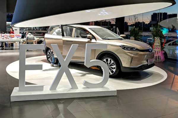 走进店内,迎入眼帘的是一辆金色的EX5 300展车。今天是周末,来店看车的人还挺多,相关的工作人员都在细心的讲解。店内装潢整体偏冷色调,搭配暖色调的沙发座椅风格比较简约。
