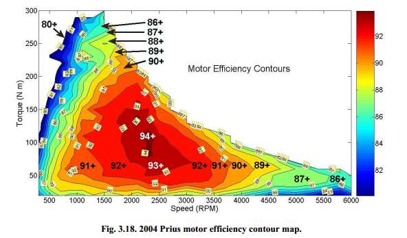再看看电机,这个图我强调一下,彩色区域和90+、94+这些数字表示的可不是消耗,是单位消耗的电量做的功,所以数字越大,颜色越红越好,跟上面内燃机的图正好是反的!