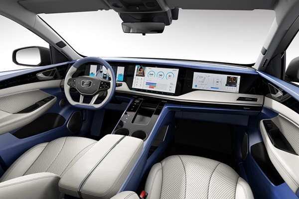 根据概念车的内饰设计,ME7中控三块巨大的屏幕连在一起,贯穿整个中控台。除了前排中控的三块屏幕,前排座椅头枕后方还有两块12.8英寸的娱乐屏,5块屏幕具有5屏联动功能。