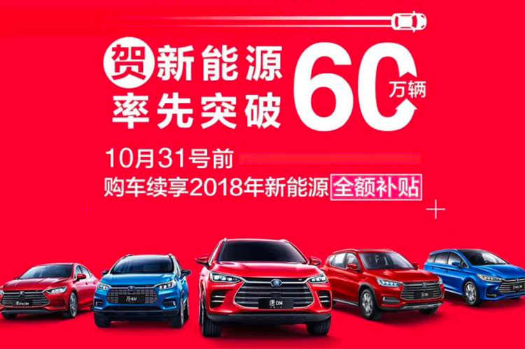 比亚迪发布宣布,在今年10月31日之前凡购买比亚迪旗下新能源汽车产品,均可享受“2018年新能源全额补贴”。