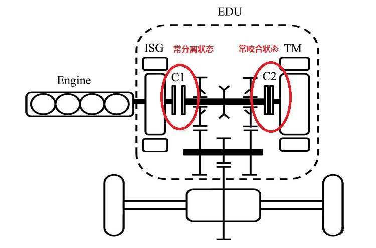 从两个离合器的常态来看,C1常态为分离装填,C2常态为咬合状态。这就意味着,这套系统的设计初衷更倾向于电力驱动。因为从动力传递路径(能量流)来看,当C1分离时,就意味着发动机的动力无法传递给变速箱,从而无法传递给车轮,此时发动机只能带动ISG电机发电。而C2处于常咬合状态,就意味着TM电机产生的动力可以直接驱动车辆行驶。