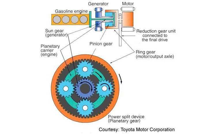如图这个行星齿轮的太阳齿轮(Sungear)与发动机连接(之间由电控离合器控制动力的通断),外齿环(Ring gear)与MG2电动机连接,并通过齿轮与输出轴刚性连接在一起。行星齿轮托架(Pinion gear)与MG1电机(发电机)相连,这就是丰田THS系统的基本构成。