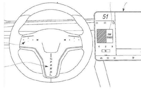 从此次曝光的专利图上我们可以看出,特斯拉现款车型上的怀挡设计已经被取消,取而代之的是在方向盘上增加了一排挡位的显示。不过目前仅从专利图上还不能确定挡位按键是物理按键式还是触摸按键式。