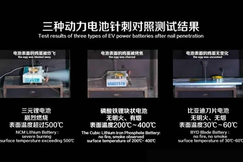 近日,比亚迪将三元锂电池、磷酸铁锂电池以及刀片电池放到一起进行针刺实验。结果显示,三元锂电池在测试过程中发生燃烧,表面温度超过了500摄氏度,磷酸铁锂电池无明火、有烟,表面温度达到了200-400摄氏度,而比亚迪刀片电池在测试过程中无明火、无烟,表面温度始终在30-60摄氏度。最终,比亚迪判定其刀片电池的安全性要高于三元锂电池和磷酸铁锂电池。