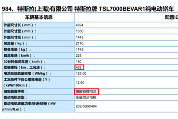 另外,从推广目录可以看到,Model 3所使用的磷酸铁锂电池系统能量密度只有125瓦时/千克,整备质量为1745千克。而去年工信部发布的第11批《新能源汽车推广应用推荐车型目录》中显示的信息为, Model 3搭载两种不同规格的三元锂电池,电池系统能量密度分别为145瓦时/千克和153瓦时/千克。续航里程分别为445、455公里。两款车的整车质量均为1614千克。