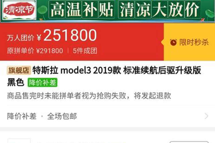 近日,想必不少网友看到了拼多多推出的“特斯拉中国-Model 3 2019款 标准续航后驱升级版”万人团购活动,并宣称“万人团价¥251800”。可以说25万左右的价格让不少网友直呼真香,老车主们当然是被迫伸脖子,继续被割韭菜了~