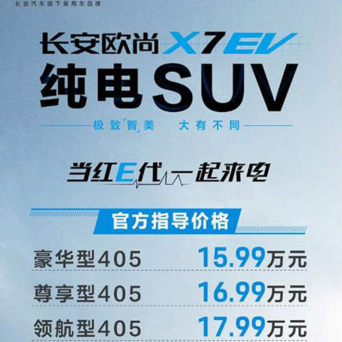 2020年8月11日,长安欧尚旗下全新纯电动紧凑型SUV——欧尚X7 EV正式上市,新车共推出3款车型,NEDC续航均为405公里,综合补贴后售价为15.99-17.99万元。