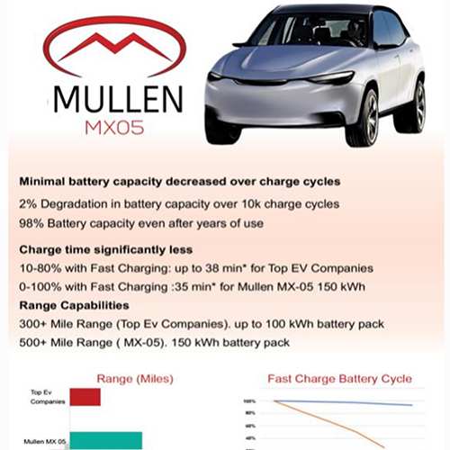 值得一提的是,Mullen计划在其SUV车型——MX-05上使用该电池技术,且在2022年实现量产。新车搭载的电池容量为150千瓦,最快可以在35分钟左右充满电量。遗憾的是,截止目前,Mullen公司并未透露具体的技术细节,如果这一电池技术能够于2022年实现量产、普及,将会对整个行业带来颠覆性变化。