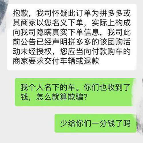然而,还是有消费者更加相信拼多多,参与了团购且已经付款。然而一特斯拉交付专员表示“我司怀疑此订单为拼多多或其他商家以您的名义下单。实际上构成向我司隐瞒真实下单信息,我司此前公告已经声明拼多多的该团购活动未经授权,您应当向付款购车的商家要求交付车辆或者退款”。