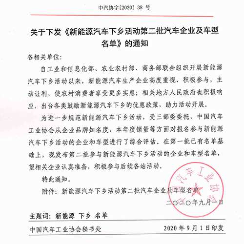 据中国汽车工业协会消息,为进一步规范新能源汽车下乡活动,受三部委委托,中汽协从企业品牌知名度,本年度销量等多方面对报名参与新能源汽车下乡活动和车型进行了综合评估。在第一批已有名单的基础上,增发第二批参与新能源汽车下乡活动的企业和车型名单。
