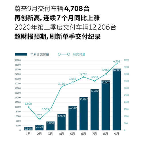 同时,蔚来官方公布:蔚来三季度交付量达12206台,同比上涨154.3%,再创季度交付量新高;2020年全年蔚来汽车累计交付26375台,前三季度交付量已超越去年全年。