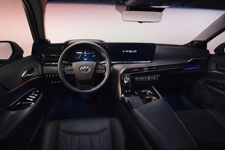 内饰方面,全新一代丰田Mirai拥有造型复杂的中控台设计,向副驾驶员一侧倾斜的空调出风口平台营造出了很强的立体感,同时中控屏等部分又向驾驶员一侧倾斜,强调了车内驾驶员的核心地位。具体来看,新车的中控屏尺寸为12.3英寸,液晶仪表尺寸为8英寸。