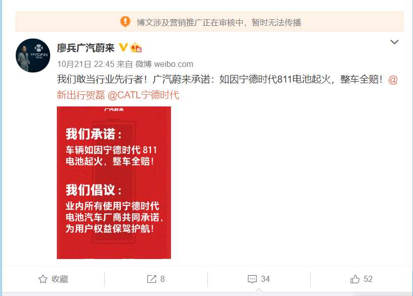 最近,广汽蔚来CEO廖兵先生发了这样一条豪横的微博,称车子如因宁德时代811电池起火,广汽蔚来整车全赔!