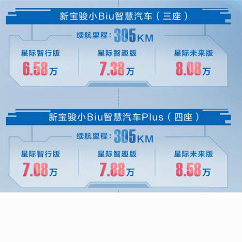 内饰部分同样在新宝骏E300的基础上进行了升级。其中增加了多处装饰,门把手上增加了“Biu”的字样,以体现其特殊身份。动力方面,新车搭载最大功率为40千瓦(54马力)的电机,峰值扭矩为150牛·米。电池部分,新车将提供三元锂电池和磷酸铁锂电池供消费者选择,对应的电池容量为31千瓦时、31.9千瓦时,NEDC工况下纯电续航里程均为305公里。