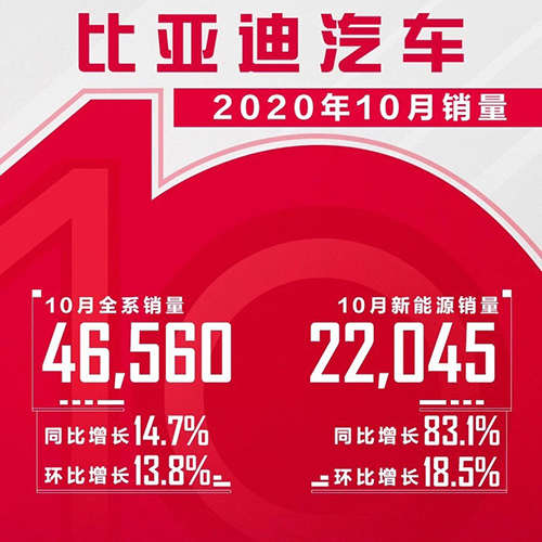 日前,邦老师从官方渠道获取到比亚迪今年10月的销量信息。数据显示,比亚迪在今年10月累计销量达到46560台,其中比亚迪汉为7545台,具体包括5055台汉EV和2490台汉DM。
