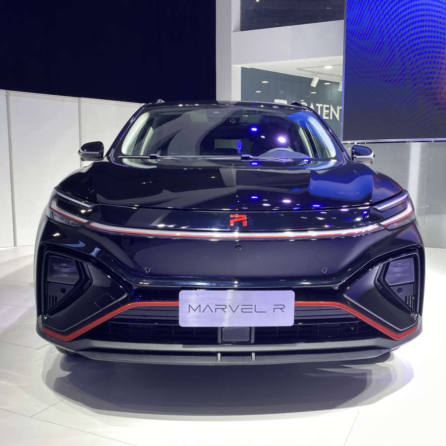 这款中型纯电动SUV最早亮相于今年五月,从外观上看,如今正式进入量产的MARVEL R与当初的展示车几乎没有区别。本次参展的MARVEL R还刻意选用了黑色车身加红色装饰组件的点缀,加上红色的品牌标识,颇具运动感和攻击性。