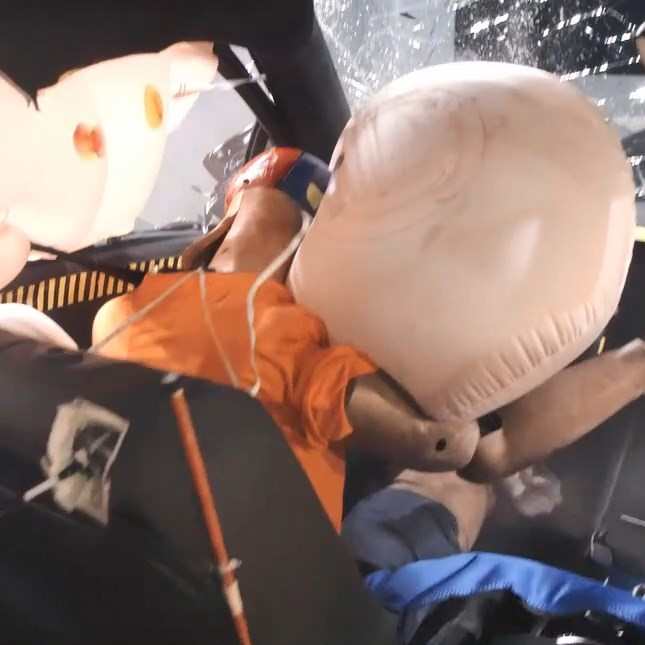 而理想ONE在约束系统与假人运动的评分上没有得到G,而是A,扣分点在乘员前倾过度。而通过舱内视频回放,我们能够发现,理想ONE的侧气帘对于A柱附近的保护不充分,驾驶员的左前方向缺乏气囊保护。