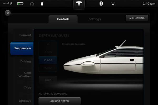 这不,为了让各位特斯拉粉多一个喜欢Model S的理由,业界良心网站Jalopnik日前又爆出了Model S的另一个彩蛋,它可以圆大家一个邦德梦,将你的爱车变身为电影《007系列之海底城》里那辆酷炫的潜艇车。