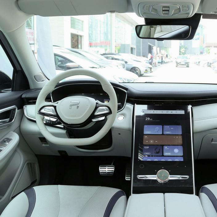 埃安LX的车身尺寸达到4786/1935/1685mm,轴距为2920mm,出色的数据给车内的大空间提供了有效支撑。内饰比起一众新势力选手来说偏保守了,布局同样更接近传统燃油车,尽管使用了视觉效果出色的双联屏,但已没有几年前的新鲜感。值得称赞的是,埃安LX的内饰用料比较下本,大面积的皮革,细节处的翻皮毛,以及哑光镀铬饰条,打造出不俗的豪华质感,非常能俘获偏传统审美用户的心。