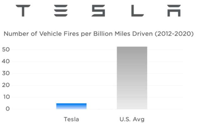 2020 年度影响力报告(2020 Impact Report)中,特斯拉提供的数据表明,2019 年,全美发生近 19 万起汽车火灾,但其中只有很小一部分涉及电动汽车;从 2012 年到 2020 年,大约每行驶2.05亿公里会发生一起特斯拉汽车着火事件。相比之下,美国国家消防协会和美国交通部的数据显示,全美每行驶 0.3 亿公里就有一辆汽车发生火灾。