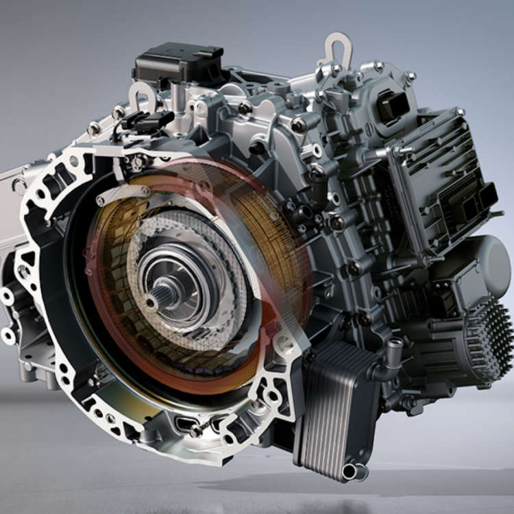 其连接特点在于通过「离合器」(K0)将「发动机」与「P2电机」的转扭耦合,故此,两者汇总的功率都可以在6速「变速机构」中得到调节。