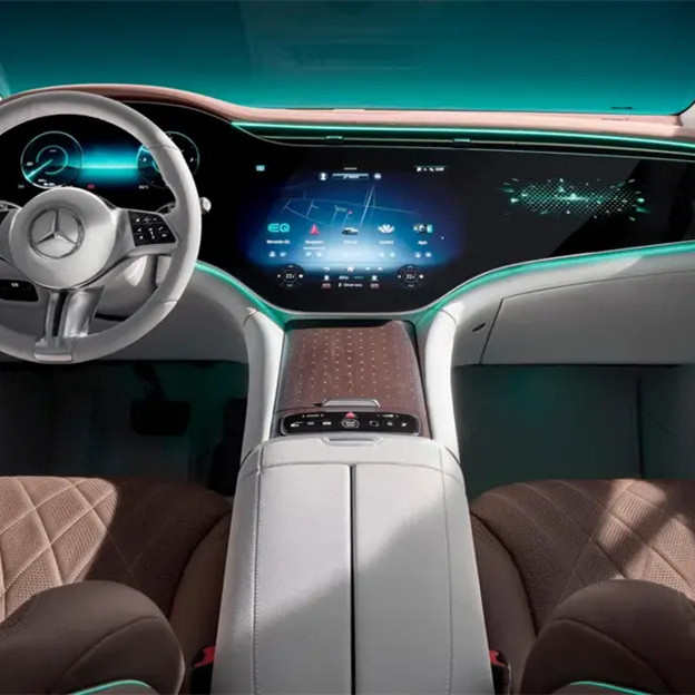 从曝光的内饰图看,EQE SUV的内饰跟轿车版的内饰基本保持一致。同时,EQE SUV沿袭了EQE轿车的Hyperscreen,它可以将仪表盘变成一个由三个独立屏幕组成的巨大玻璃面板,提供56英寸的显示空间,视觉冲击感极强,科技感十足。