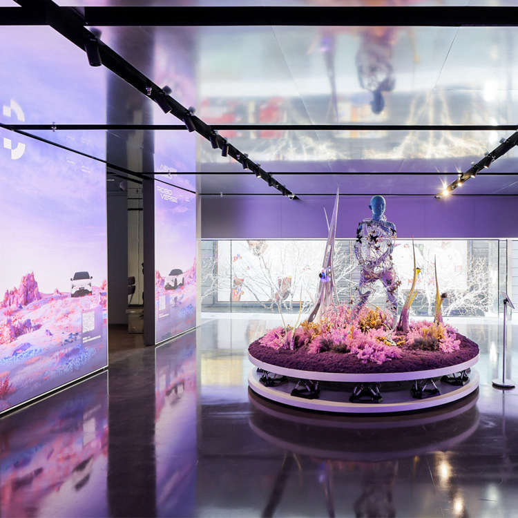 体验店的一楼大概就是这样了,这里使用了大量的玻璃和镜面效果,再加上外围的大幅落地窗,倒是让小空间也变得比较通透了一些,另外大量“集度紫”与金属材质的运用,倒真是让店里有了点“赛博味儿”了。