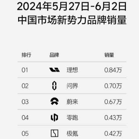 问界单周销量0.7万辆依旧排在新势力第二名,值得一提的是,当前新M5和新M7 Ultra已经开启大规模交付,余承东在发布会上坦言,6月第一周将交付4000辆M7 Ultra,那么极有可能在下一周,问界会重新夺回单周销冠。