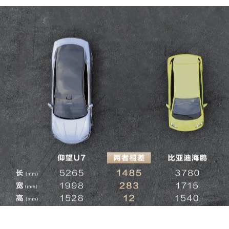 官方将仰望U7与比亚迪海鸥进行对比,仰望U7长宽高分别为5265/1998/1528mm,海鸥长宽高分别为3780/1715/1540mm,两车长宽高分别相差1485/283/12mm。在宽度为10米的场地道路进行转弯半径对比测试,两车均能轻松通过。最终仰望U7的转弯半径为4.85m,甚至比海鸥的4.95m表现更优。