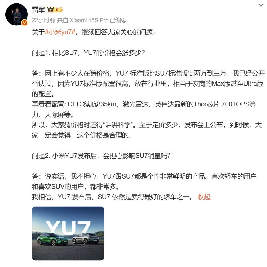 雷军确认,YU7的价格将在6月26日的发布会上公布,并相信大家会认为其定价合理。同时,他也强调,YU7上市后不会影响SU7的销量,因为轿车依然拥有庞大的用户群体。