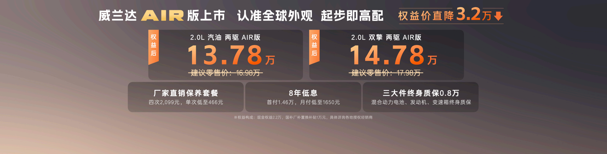 全新换代威兰达AIR版以全球设计为基底,通过配置、智能、动力的全方位升级打造产品硬实力,而入门满配的设定,让消费者以入门价格获得高价值配置体验。