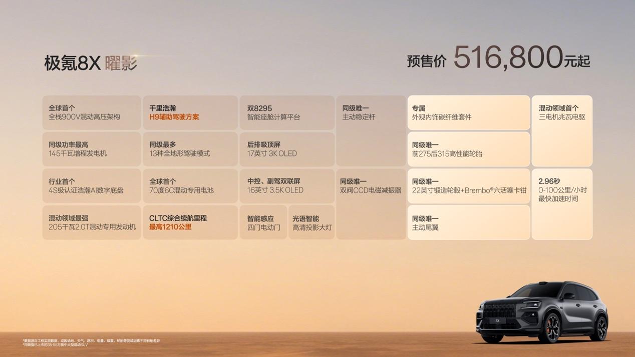 顶配曜影版本预售价51.68万元起,定位全系性能旗舰,搭载三电机兆瓦电驱,零百加速最快2.96秒,跻身全球2秒俱乐部中大型混动SUV行列,主打极致驾控乐趣,瞄准追求性能体验的高端用户。
