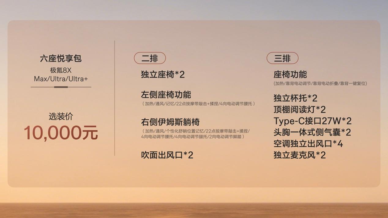 值得注意的是,官方针对多成员家庭的出行场景,极氪8X还提供六座选装包,选装价10000元,可在大五座布局基础上拓展为六座,完美适配二胎、三胎家庭或多人同行的用车需求。