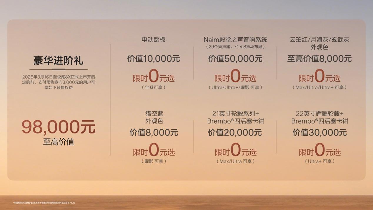 3月16日,极氪旗下定位大五座高性能旗舰的极氪8X正式启动全网预售,四款车型覆盖37.68万元至51.68万元价位段,同步落地配套购车权益。