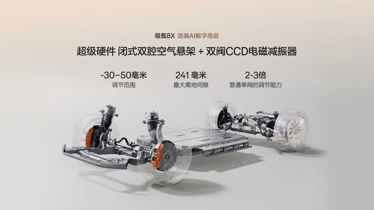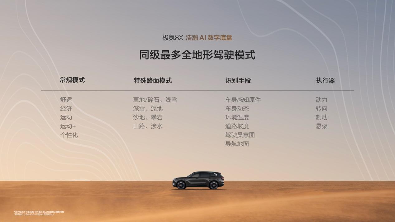 动力之外,驾控质感也是高端SUV的核心考量,浩瀚AI数字底盘则为极氪8X带来了越级操控体验。作为行业内首款4S级AI数字底盘,它通过车端、路况、云端全域感知信息融合,由定海智能中枢统一调控底盘动态,让车辆能自适应不同路况的行驶需求。