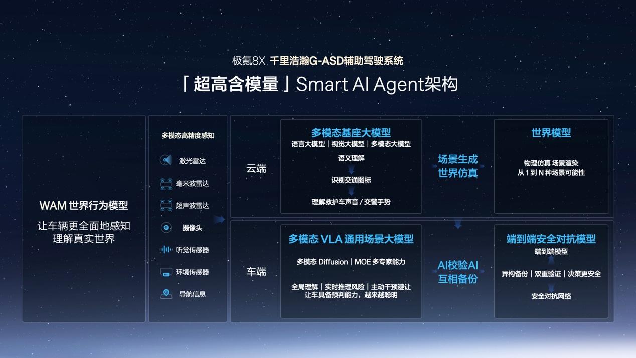 步入智能出行时代,高阶辅助驾驶已成高端车型标配,千里浩瀚G-ASD辅助驾驶系统成为了极氪8X的一大亮点。这套系统采用Smart AI Agent架构,摆脱传统规则驱动的局限,转向模型驱动的智能驾驶模式。