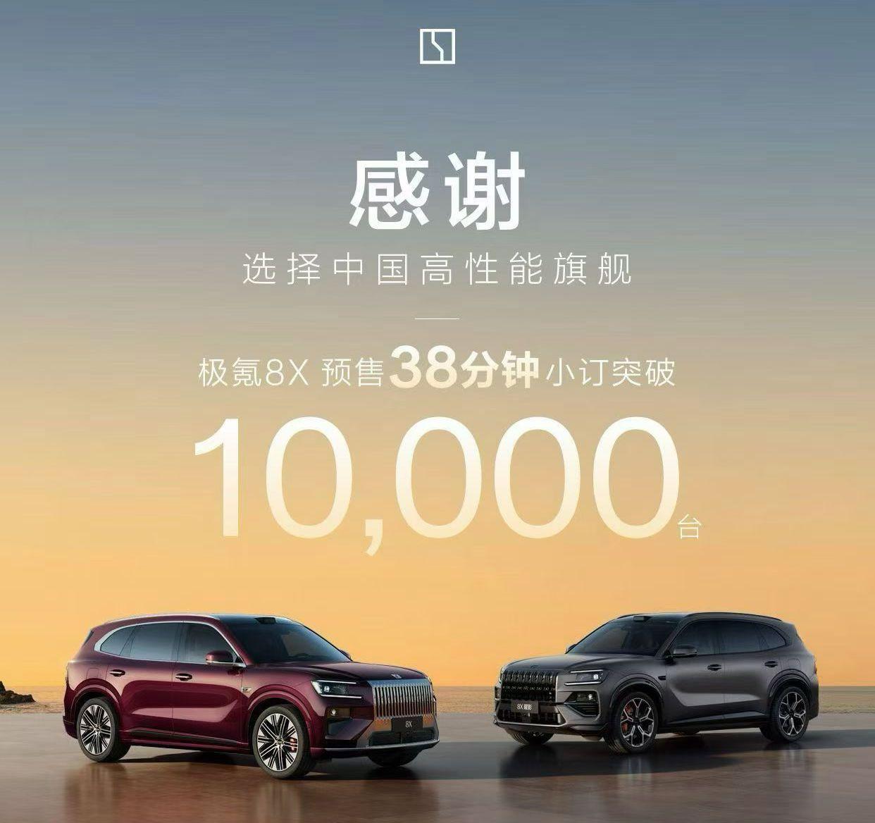 而38分钟小订破万的成绩,似乎也预示着极氪8X将成为极氪9X后的又一款热卖产品。