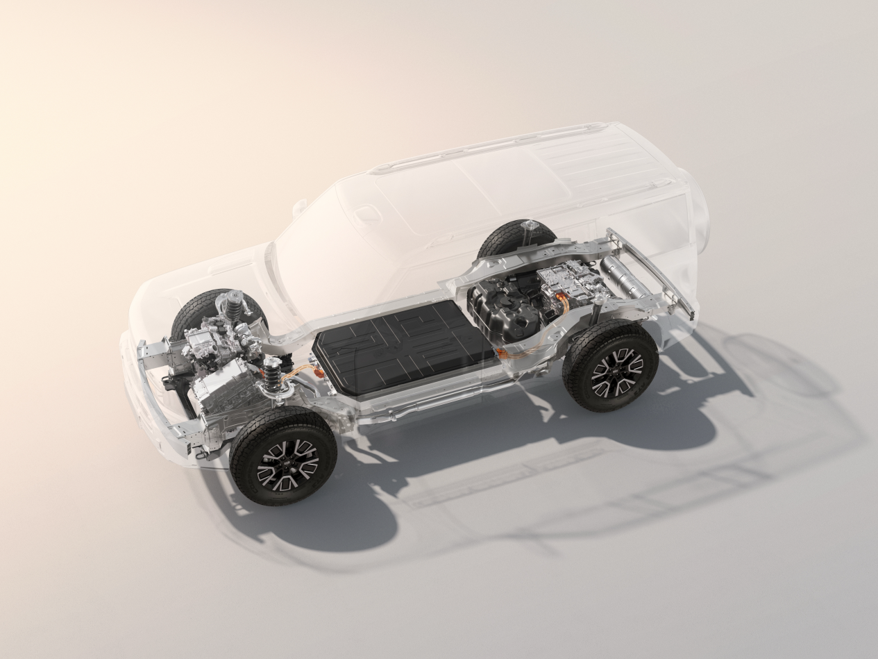 吉利坚持以三电为核心正向研发,拒绝“油改电”的妥协思路,原生设计实现极致越野性能与城市舒适性的平衡。高空间利用率三电布置,减小舱内空间的侵占,乘坐、储物空间更大;通过电池内凹设计、电池底部6层结构防护等设计,全方位保障越野用车安全。50:50前后轴荷比,让四轮抓地力更平均,操控响应更精准、可预测。同时,通过油电气分离设计,避免因油电气两两混合造成的火灾隐患,带来更高安全保障。此外,该架构还为更大电池、更大油箱的布置提供了充裕空间。