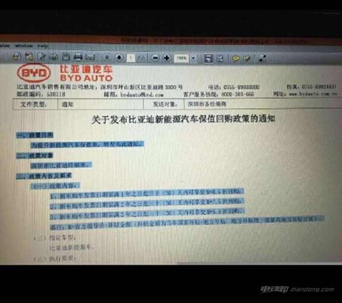 1月6日下午,网友@霏非凡在其个人微博上曝光了一张手机截图,截图是比亚迪官方向深圳地区的经销商发送的一份通知,标题显示为“关于发布比亚迪新能源汽车保值回购政策的通知”,通知内容显示:新车购买发票日期满1年之日起30天内可享受M*85折回购,发票日期满2年之日起30天内可享受M*75折回购,而发票日期满3年之日起30天内可享受M*65折回购。其中,M的定义为官方指导价减去购车补贴金额(包含国家+地方补贴)之后的价格,也就是车主的购买比亚迪新能源车实际支付价格。