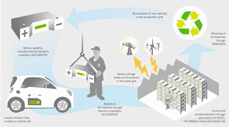 电池储能系统都是由戴姆勒下属子公司ACCUMOTIVE来生产和改造,原材料来自于戴姆勒集团旗下未来所有的电动汽车和插电式混合动力汽车。储能电站的搭建和市场营销则是由合资公司来完成的,而当这些电池再次从储能电站中退役,回收再造的工作则有另一家名叫REMONDIS的公司来操作。
