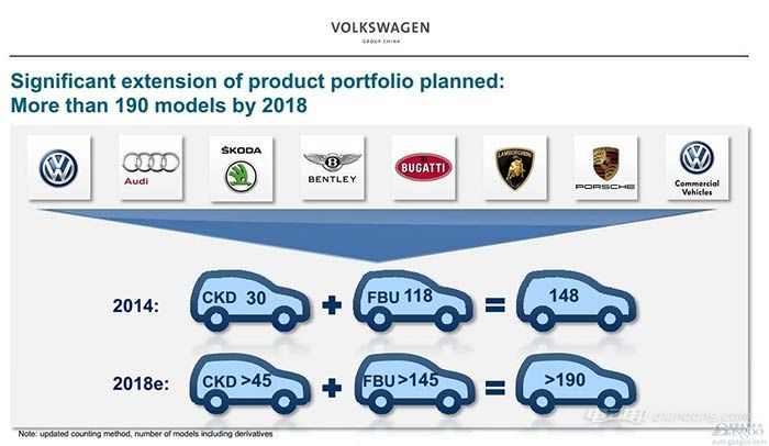 2014年,大众汽车集团在中国市场国产车(CKD)有30款,进口车(FBU)118款,总计148款;预计到2016年这一数字将拓展至160款,到2018年这一数字增至190款以上(国产超过45款,进口超过145款)。