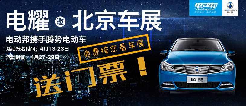 2016(第十四届)北京国际汽车展览会(Auto China 2016)(以下简称“2016北京车展”)将于2016年4月25日—5月4日在中国国际展览中心新馆和老馆同时举行。届时,电动邦联手腾势品牌,组织10辆腾势纯电动车分别在4月27日、28日两天各免费接送10位新能源待购车主参展,并附赠车展门票。共有20个名额,抢座机会先到先得。