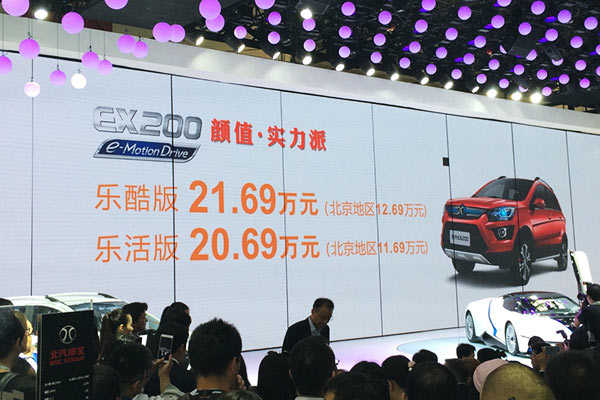 在2016北京车展上,北汽新能源首款纯电动SUV-EX200正式上市,新车基于绅宝X25打造而来,综合续航里程200公里。此次上市新车按配置不同共两款车型,乐酷版售价21.69万元(北京地区补贴后价格12.69万元)、乐活版售价20.69万元(北京地区补贴后价格11.69万元)。