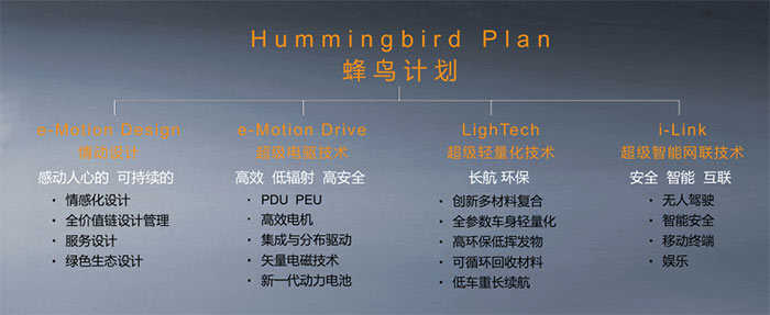“蜂鸟计划”是在北汽新能源十三五战略规划之后发布的首个技术战略,也是对北汽新能源十三五战略规划提出的技术战略的落地计划。作为北汽新能源引领行业未来的技术战略,“蜂鸟计划”涵盖了e-Motion Design(情感化设计)、e-Motion Drive(超级电驱技术)、LighTech(超级轻量化技术)、i-Link(超级智能网联技术)。e-Motion Drive能够更高度集成PDU、PEU、高效电机、集成与分布驱动,矢量电磁技术与新一代动力电池高度整合,带来高效率、低辐射、高安全的驾驶体验;LighTech就是通过全参数车身轻量化与大规模复合、环保、可循环材料,让整车续航更长、更环保。i-Link,简单讲,就是在目前网联技术的基础上,增加无人驾驶功能。