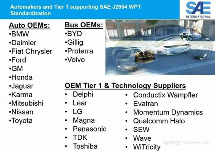国际汽车工程师学会是一个技术性学会,它在全球范围内拥有超过 143000 名会员,会员均是航空航天、汽车和商用车辆行业的工程师和相关技术专家。目前,大部分汽车制造商都在遵循器其制定的“SAE J1772”插电式充电技术规范,新的无线充电标准发布后,戴姆勒(宝马)、菲亚特-克莱斯勒、福特、通用、本田、捷豹路虎、三菱、日产以及丰田等汽车厂商纷纷表示欢迎,并签署了相关协议。另外,德尔福、LG、松下、东京电气化学TDK等重要的汽车行业原始设备制造商也都签署该协议。值得注意的是,在众多汽车厂商当中,我们看到了“比亚迪”的名字,这意味着比亚迪也正在积极推进无线充电技术的研发,同时也在谋划与其他品牌车型的充电网络共享,不过目前比亚迪是作为“电动巴士生产商”签署的该协议,但有了电动大巴的作为走出国门的基础,相信比亚迪也将进一步推动旗下新能源乘用车进入国际市场。