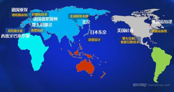 北汽新能源五国七地研发中心战略定位上同样各有侧重,其中,日本东京和意大利都灵两大全新的海外中心,主要承担前瞻性造型设计方面的重任;美国底特律研发中心致力于电动汽车核心技术——电驱动总成系统的研发工作;硅谷研发中心侧重整车控制技术提升、互联网和智能化领域;德国亚琛研发中心主要承担增程式电动汽车动力系统研发,预计首款产品将于2017年底上市;德国德累斯顿研发中心,负责开发全新的轻量化多材料整车、全新的轻量化设计以及材料应用技术;西班牙巴塞罗那研发中心,负责高性能运动车型的设计和研发。