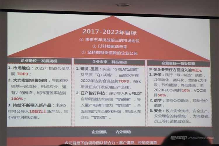 东风日产计划在未来5年内推出10款以上产品,其中包括纯电动车型。同时其还计划进一步加强经销商布局,到2022年全国城市覆盖率将达到100%。此外,日产还计划将ProPILOT驾驶辅助系统导入到国内。