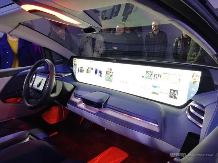 6. 新车最大亮点在于内饰:一款长125厘米、高25厘米的大屏幕横贯整个中控台,坐在大屏幕前宛如坐进了网吧!此外还可以根据环境光照的变化来调整明暗度,并支持手势调节功能。在双辐方向盘中央也有一块9英寸的触碰屏,集成了和驾驶员相关的车辆功能操作,如座椅调节等。