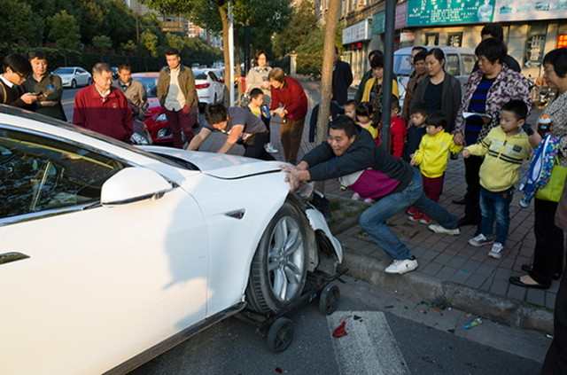近日,一辆特斯拉在杭州发生交通事故,但事后车主受伤随后离车,期间也没有交代拖车事宜,由于不了解其结构,找不到解除“手刹”的方法造成车拖车师傅不敢轻举妄动。换了几家拖车公司,情急之下大家使用四轮小车才将事故车推上板车,整个拖车耗时两小时迎来无数围观者。