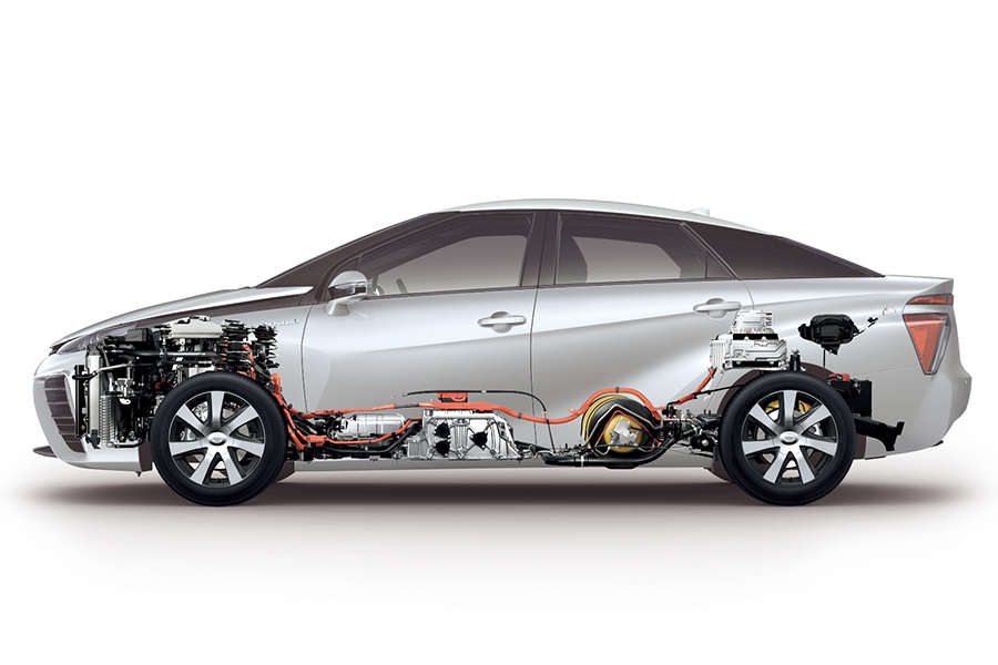 因为氢分子体积小,可以透过薄膜的微小孔洞游离到对面去,但是在穿越孔洞的过程中,电子被从分子上剥离,只留下带正电的氢质子通过,氢质子被吸引到薄膜另一侧的电极与氧分子结合。电解质薄膜两侧的电极板将氢气拆分成氢离子(正电)和电子、将氧气拆分成氧离子(负电)和电子,电子在电极板之间形成电流,两个氢离子和一个氧离子结合成为纯水,是反应的废物。所以本质来讲,整个运行过程就是发电过程。因此Mirai是纯电动车,燃料电池堆栈代替的就是厚重且充电效率低下的锂离子电池组。